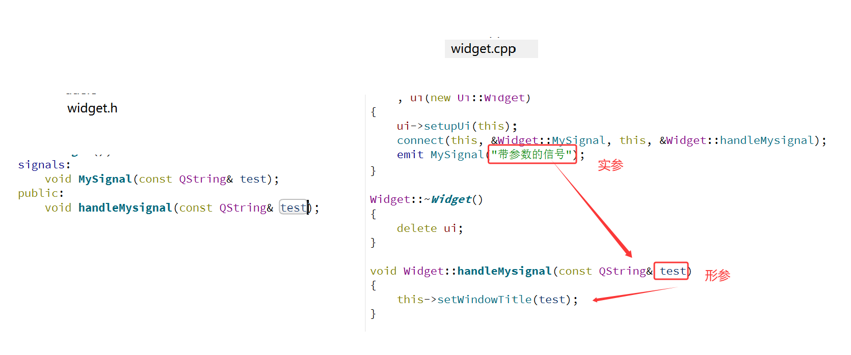 - 当信号带有参数时,槽的参数必须和信号的参数一致。(这里的一致指的是参数类型一致,个数不一致也是可以的,信号的参数个数要大于等于槽的参数)此时信号触发,调用到槽函数的时候,信号函数中的实参就能够被传递到槽函数的形参当中