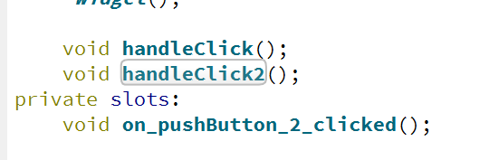 - on_pushButton_2_clicked:将pushButton_2这个控件的clicked信号和当前这个函数建立连接,当点击按钮2,就会执行这个槽函数,将按钮1连接的槽函数1换成槽函数2