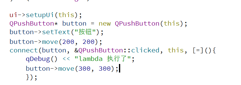 - lambda表达式是一个回调函数,这个函数无法直接获得上层作用域中的变量的,因此,当我们需要每点击一次按钮,按钮就会移动到某一个位置时,无法直接获得button,为了解决这个问题lambda引入了变量捕获,通过"变量捕获"获取到了外层作用域的变量,在[ ]中加入想要使用的变量:[button, this],如果想要捕获更多的变量,可以直接使用[=],这个写法的含义是将上层作用域中的所有变量都捕获