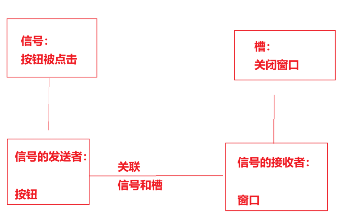 - 信号和槽是Qt特有的消息传输机制,它能将相互独立的控件关联起来。比如,"按钮"和"窗⼝"本身是两个独立的控件,点击"按钮"并不会对"窗口"造成任何影响。通过信号和槽机制,可以将"按钮"和"窗⼝"关联起来,实现"点击按钮会使窗口关闭"的效果。