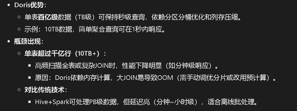 目前来讲:数据量达到一定级别,doris 性能就跟不上了。
