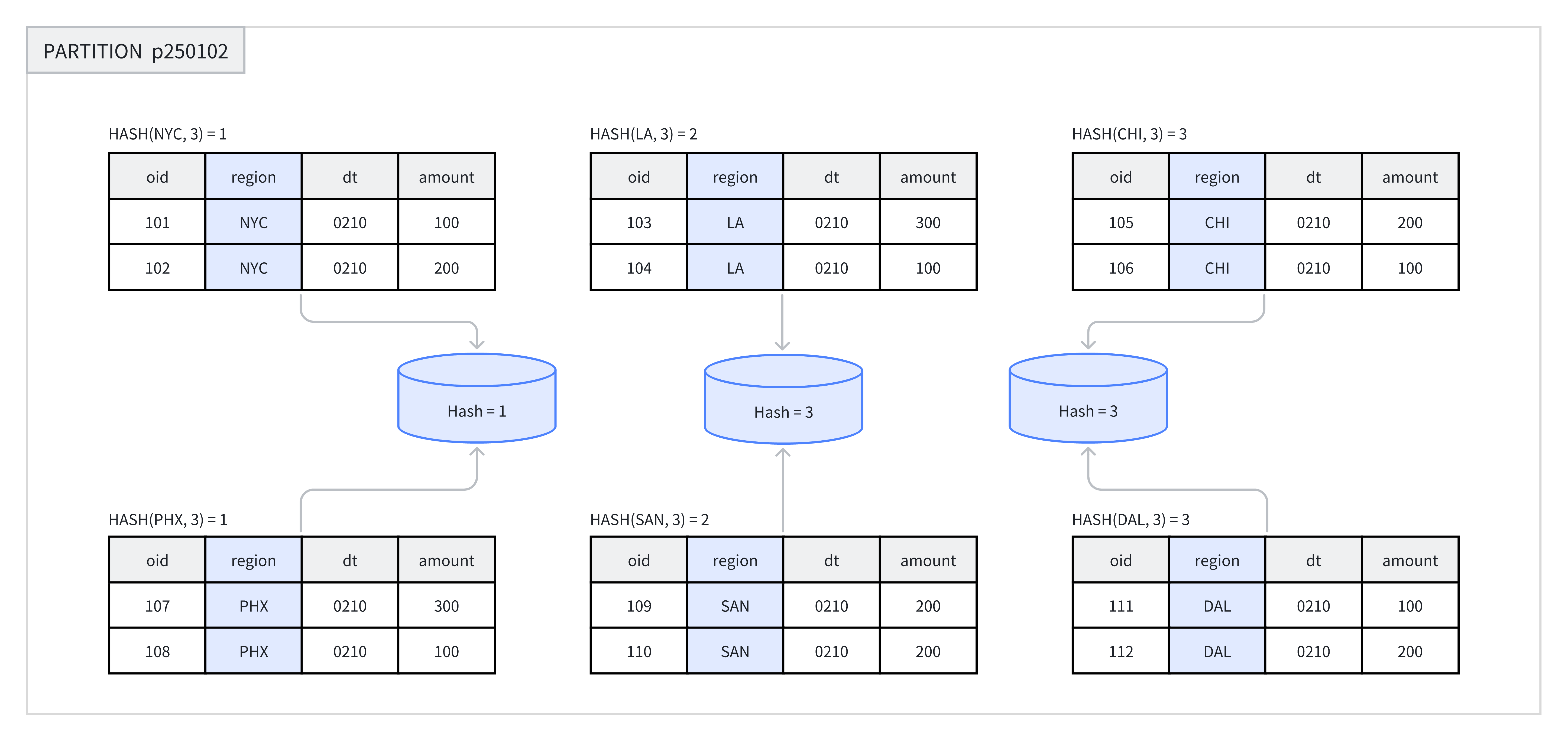 DISTRIBUTED BY HASH(region) BUCKETS 8
