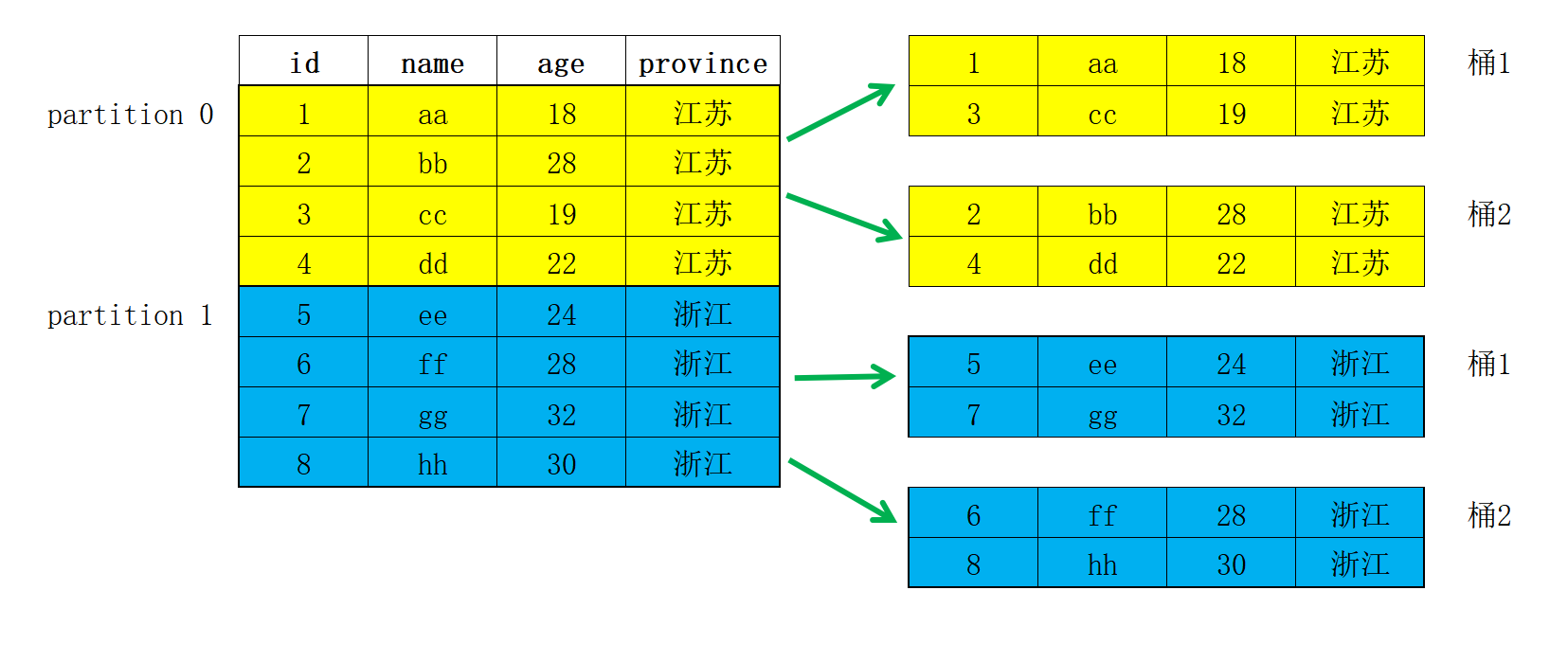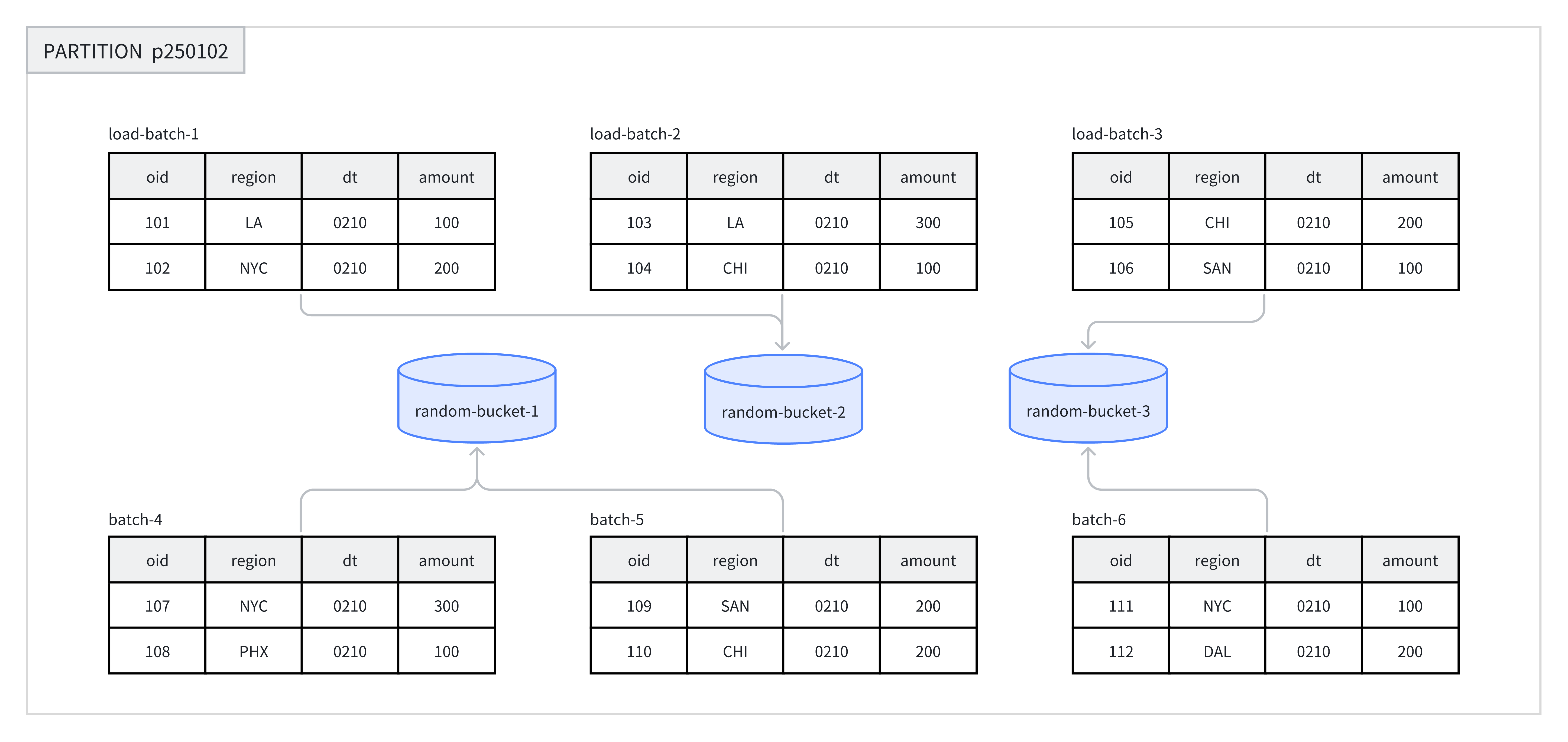 在每个分区中,使用 Random 分桶会随机地将数据分散到各个分桶中,不依赖于某个字段的 Hash 值进行数据划分。Random 分桶能够确保数据均匀分散,从而避免由于分桶键选择不当而引发的数据倾斜问题。