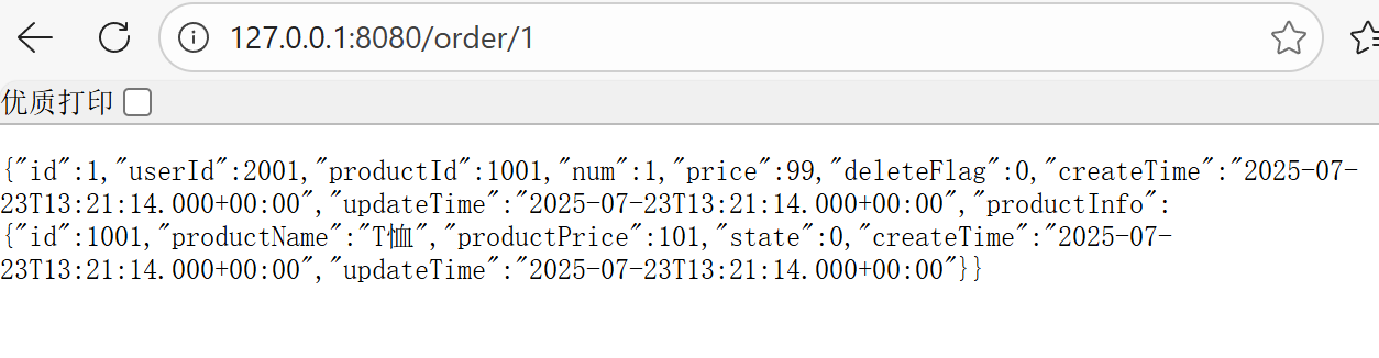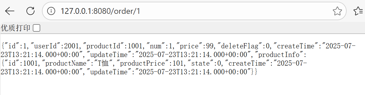 启动product-service 和order-service 服务,访问 127.0.0.1:8080/order/1 接口,测试远程调用: