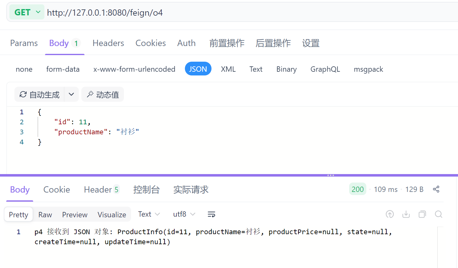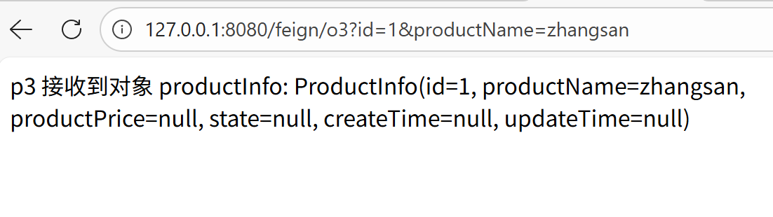 访问 127.0.0.1:8080/feign/o3?id=1&productName=zhangsan 接口,测试远程调用: