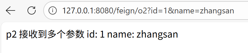 访问 127.0.0.1:8080/feign/o2?id=1&name=zhangsan 接口,测试远程调用: