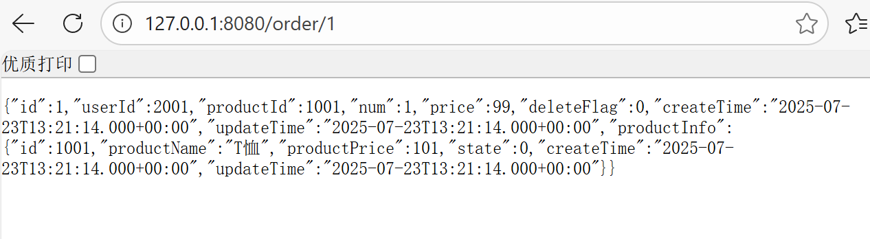 启动服务,访问 127.0.0.1:8080/order/1 接口:
