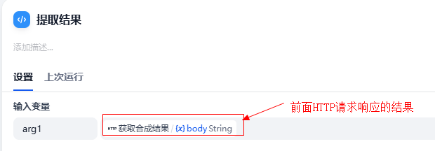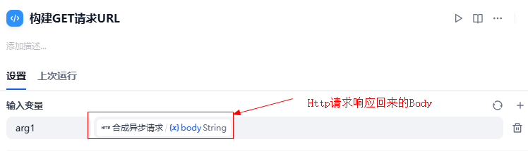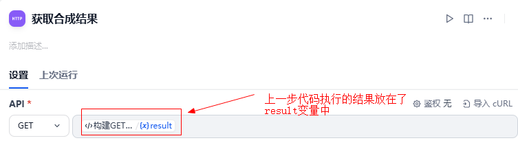 添加一个 代码执行节点,它会执行一段代码,提取上个http请求返回的 event_id,生成GET请求的URL保存到变量中