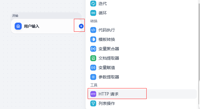 新建一个工作流,在开始节点后面添加HTTP请求节点:
