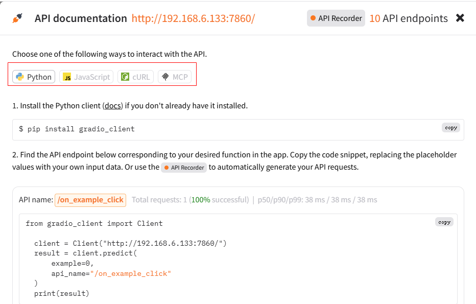 在http://192.168.6.133:7860/ 上,打开 API Recorder 按钮,然后再页面上进行操作:
