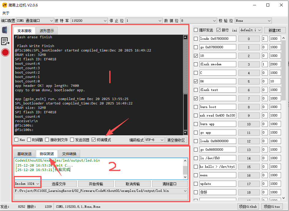 我这里做一个简要的描述。在文本接收中,如果你想要可输入,把终端模式勾上,如果只是想看输出,就取消。然后在协议发送中,选择Xmodem 协议,然后选择指定的文件发送。