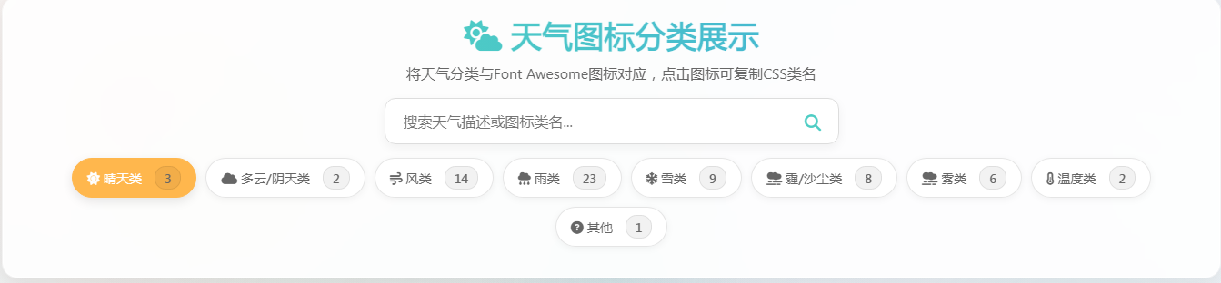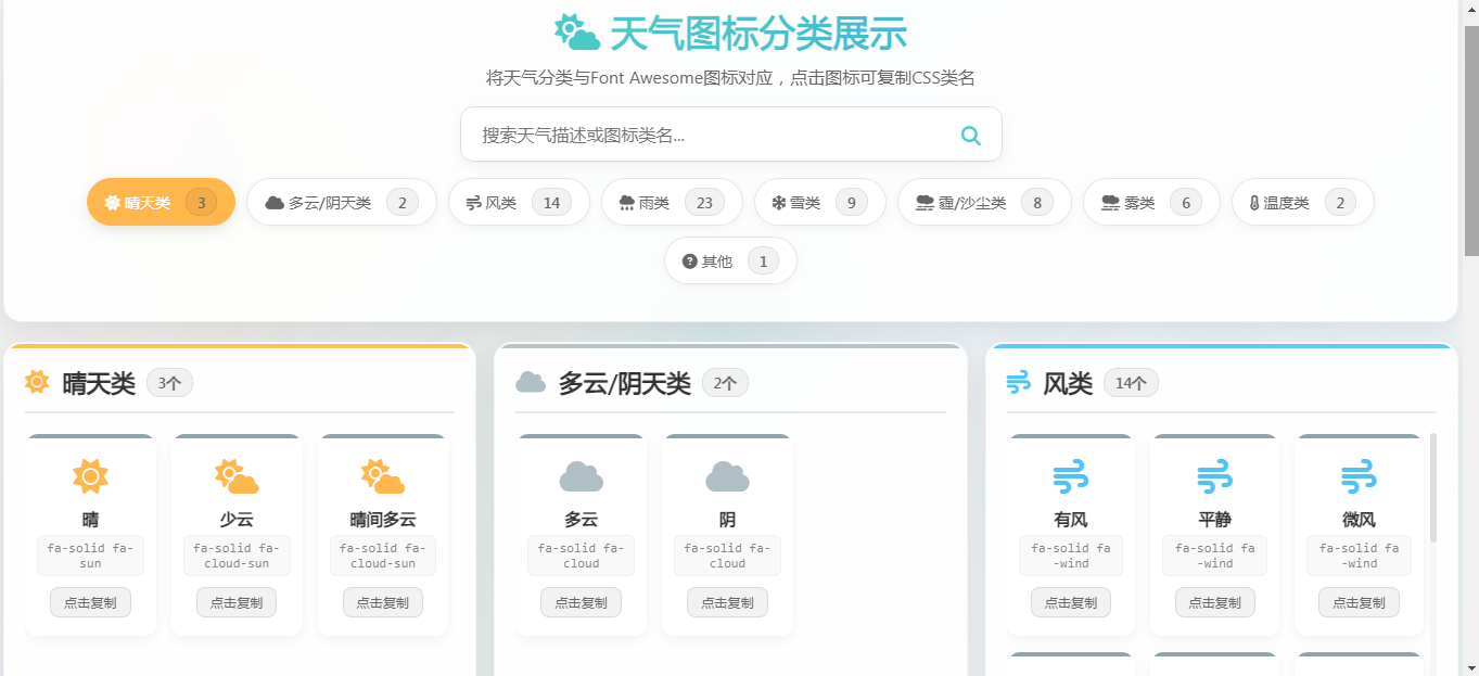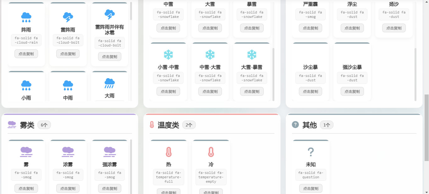 例如,以下是一些常见的天气图标及其对应的 Font-Awesome 类名: