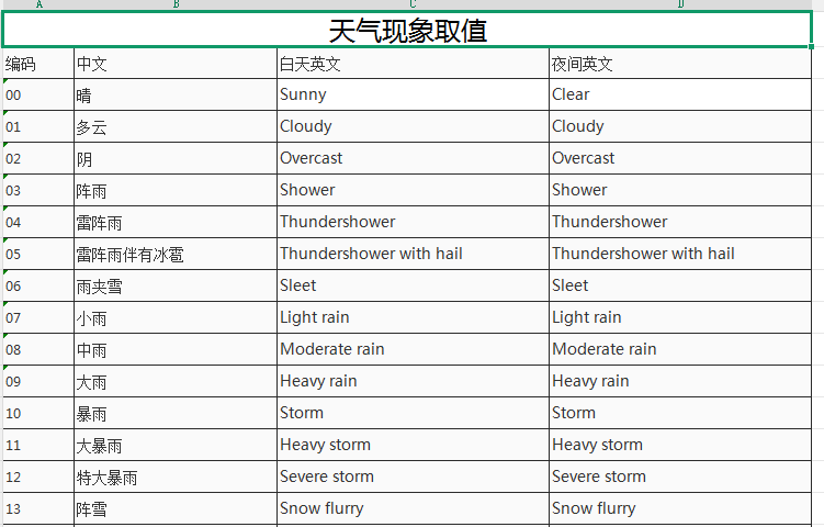 在其返回参数的明显位置可以看到有一个对应的天气现象的取值对照表(也就是我们俗称的映射表),通过这个我们就知道在平台中可能会返回多少种天气情况,跟随系统,我们点开超链接来看一下具体的文本,打开下载下来的Excel表格,可以看到以下的天气对照信息。