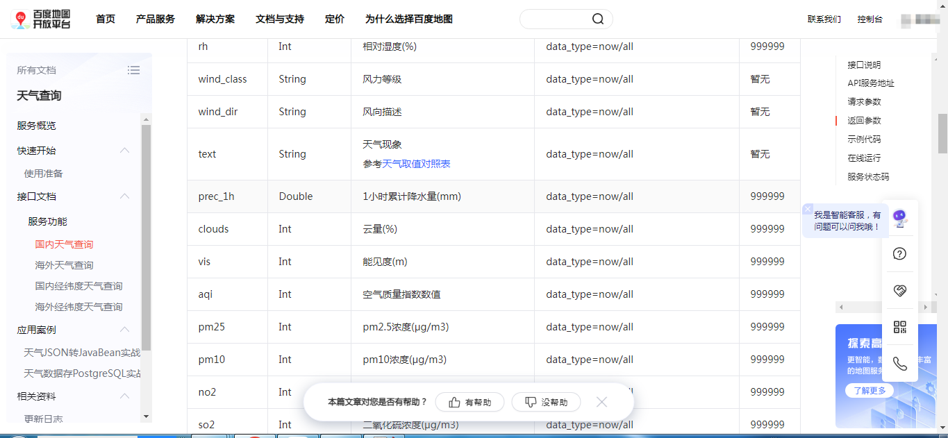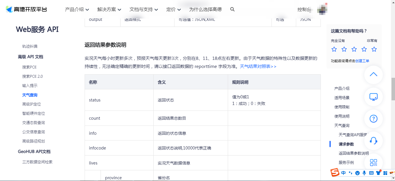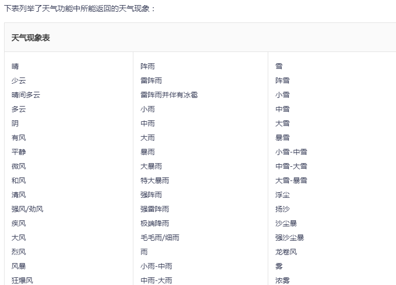 与百度开放平台类似,高德地图开放平台也有同样的中文天气描述映射关心表。访问地址如下:高德地图开放平台天气信息服务。打开后的页面如下:
