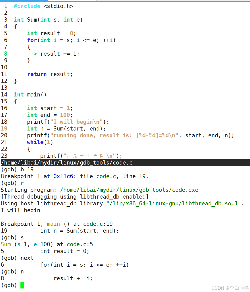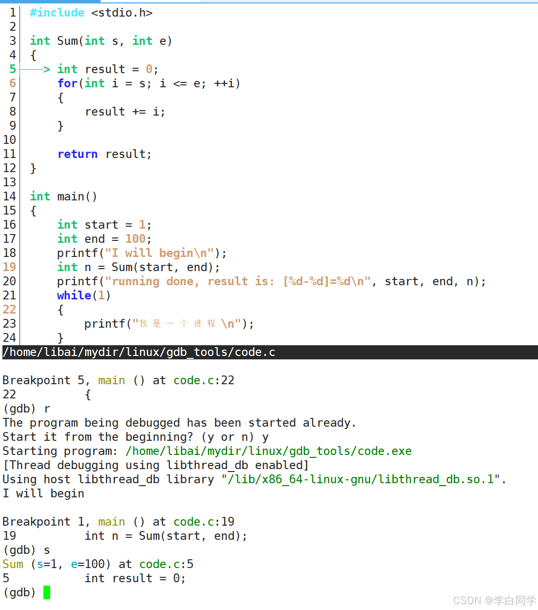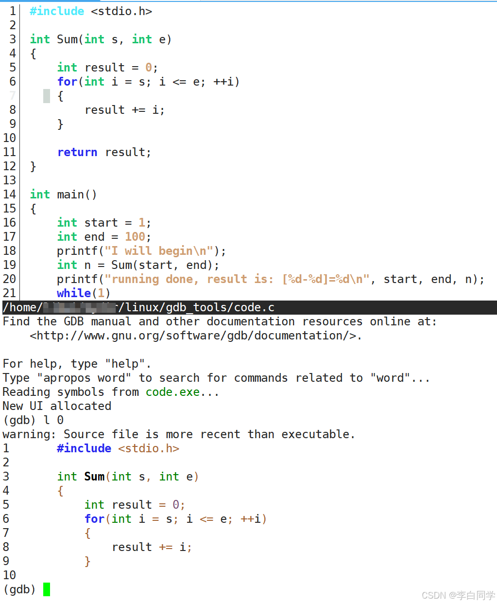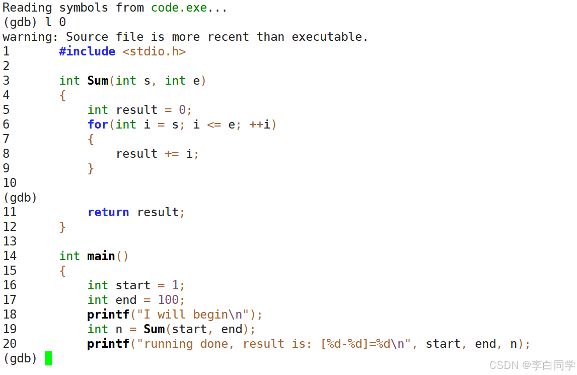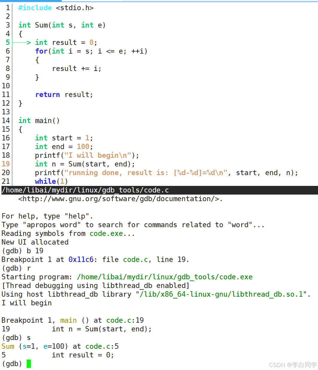 ~/mydir/linux/gdb_tools$ gcc -o code.exe code.c -g # debug 版本,支持调试