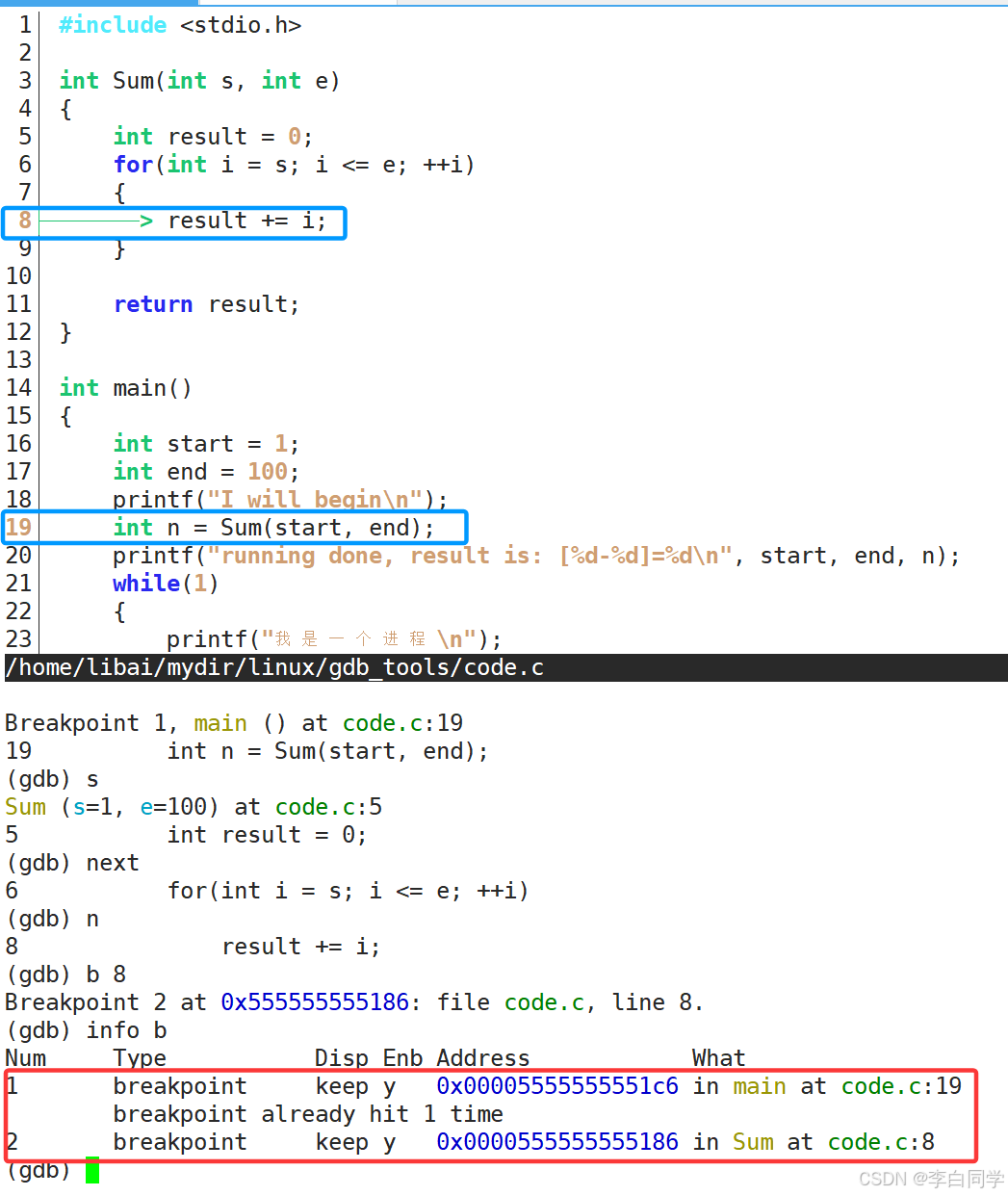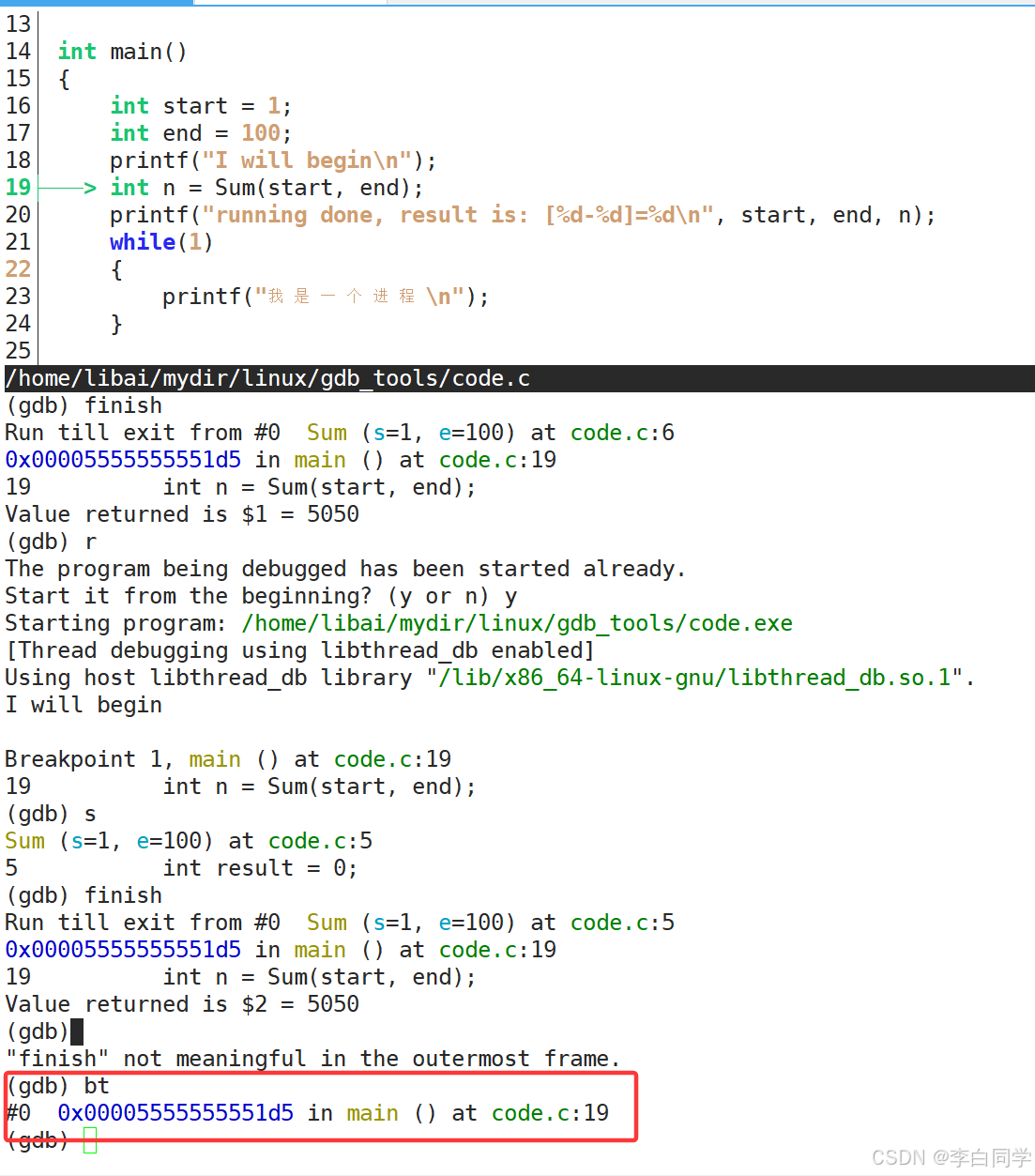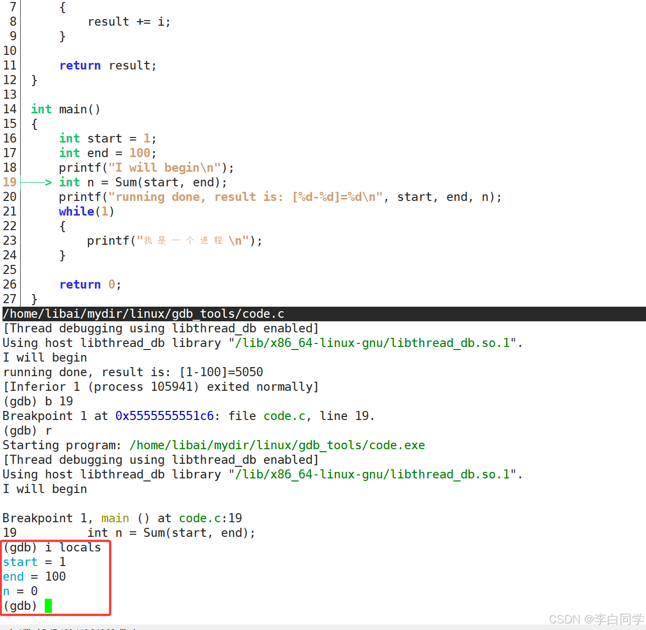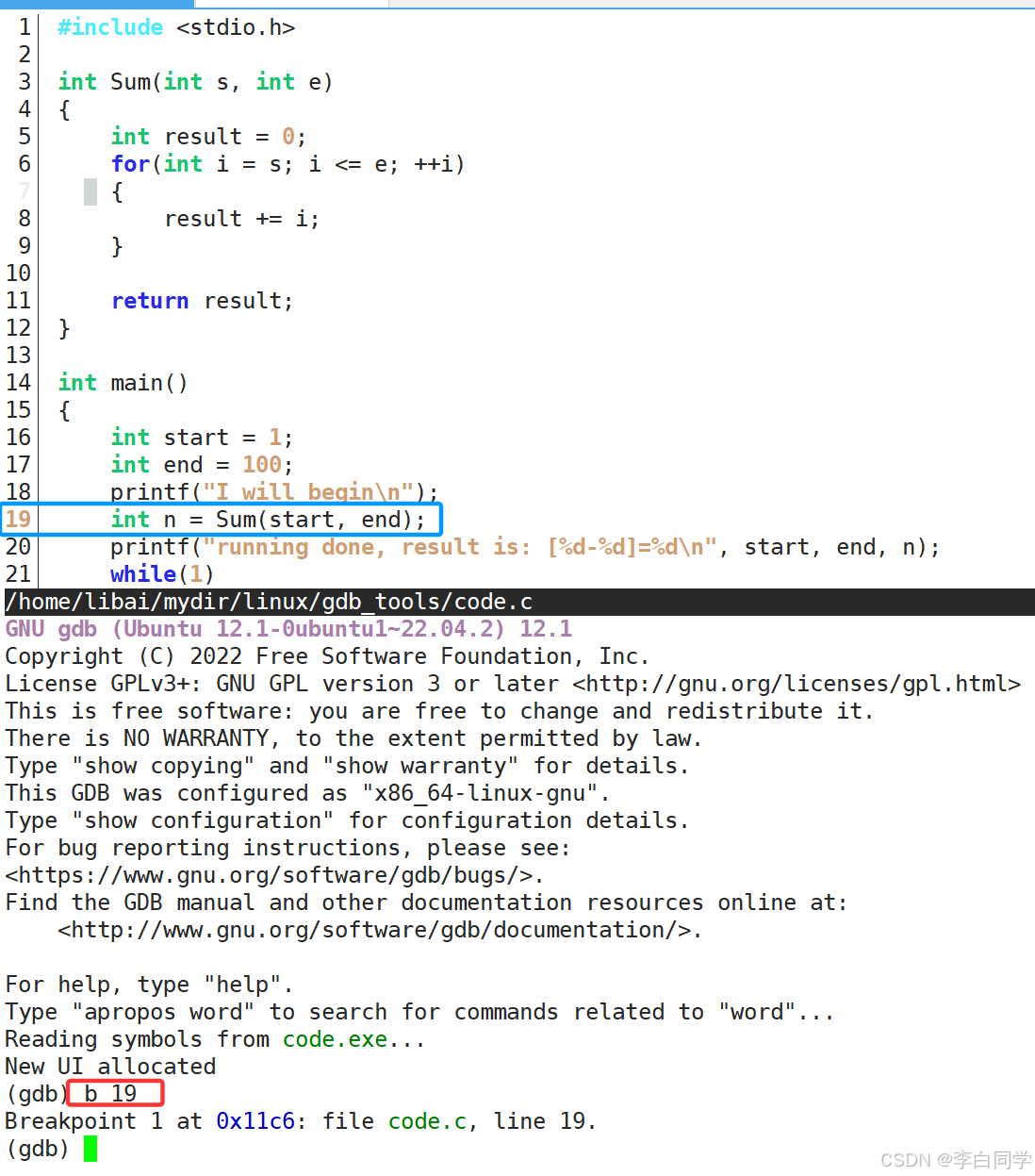 ~/mydir/linux/gdb_tools$ gcc -o code.exe code.c -g # debug 版本,支持调试