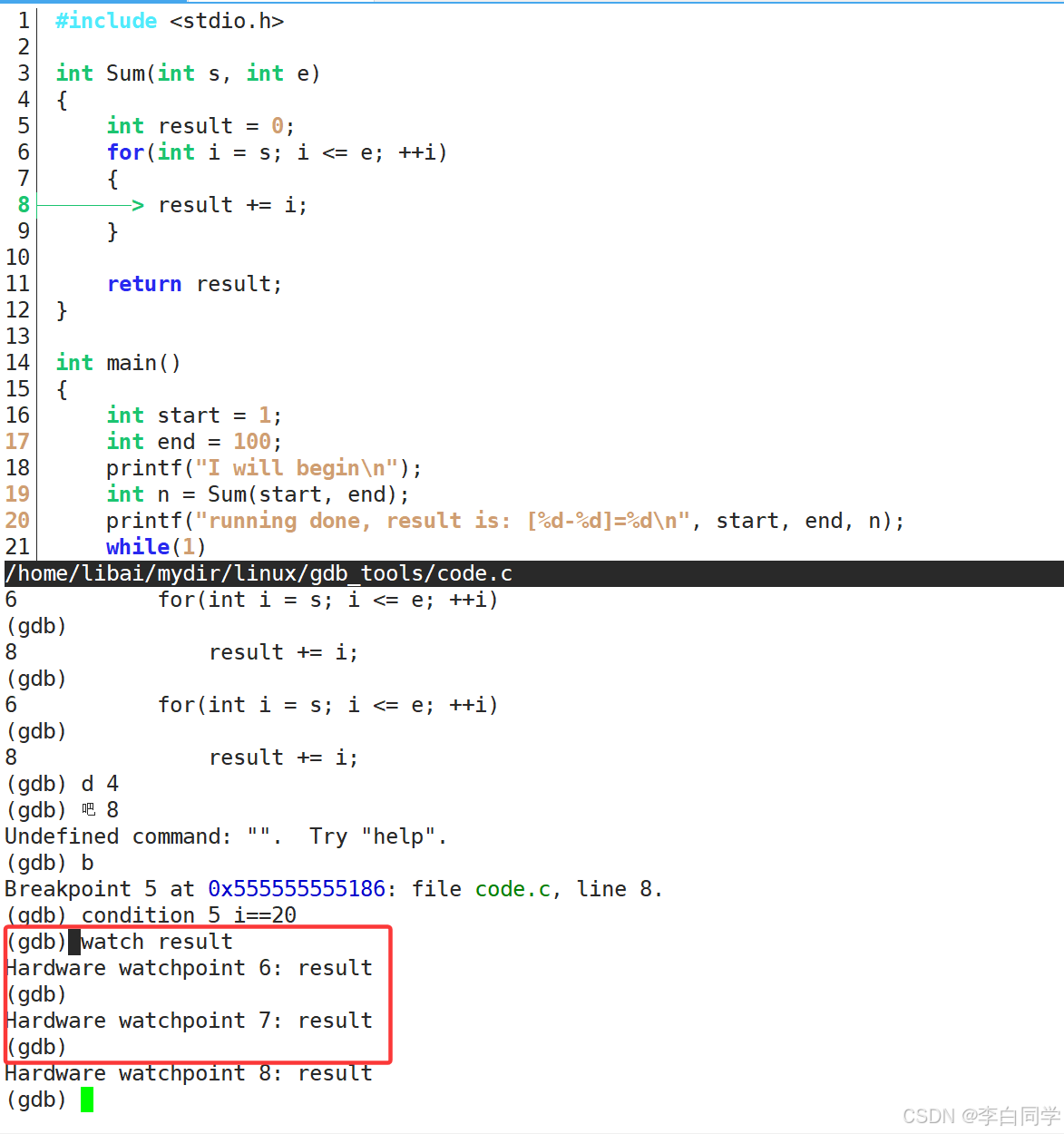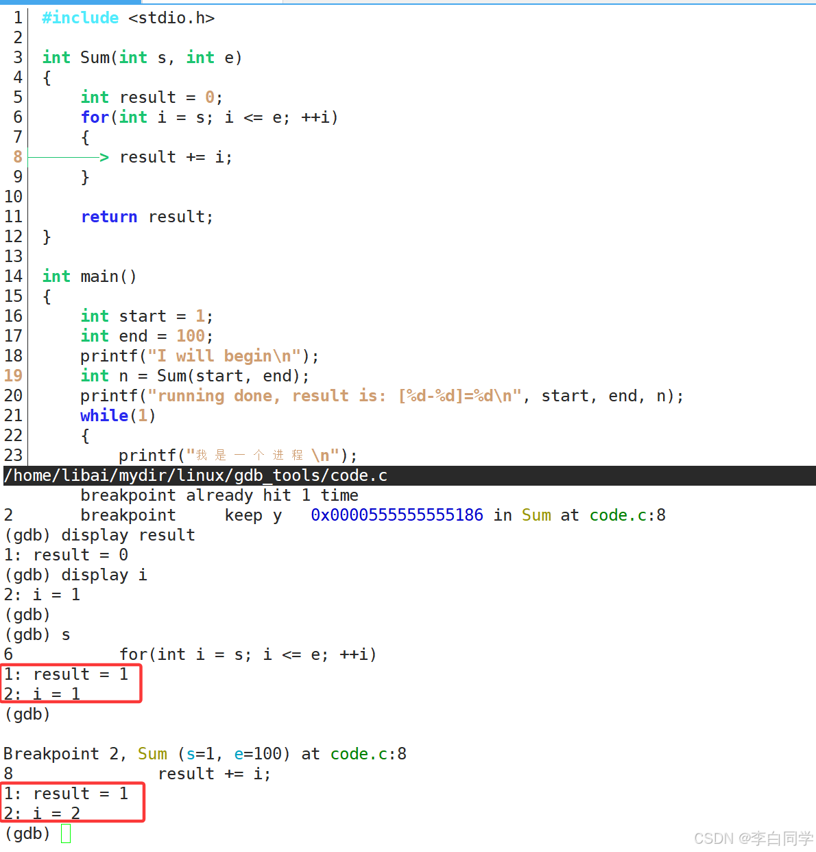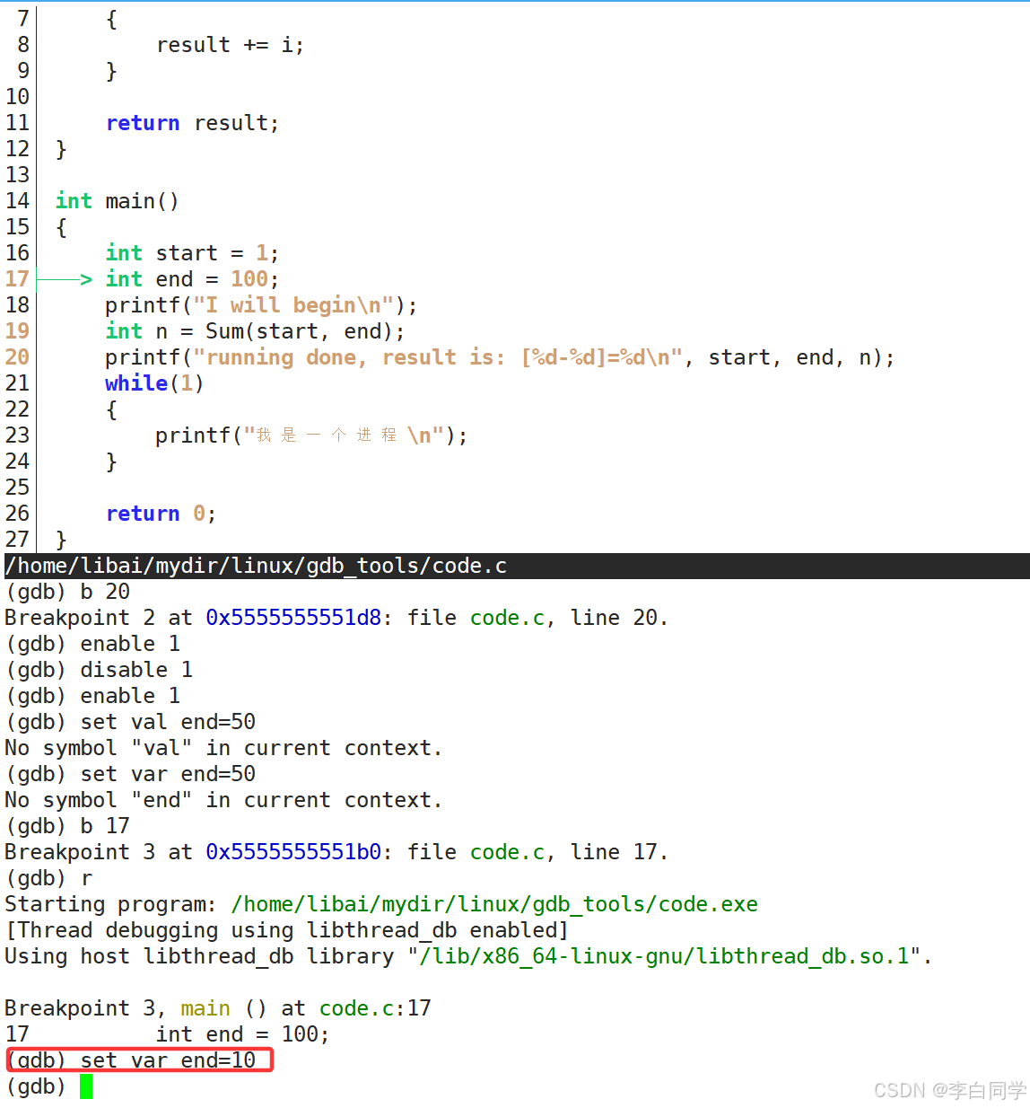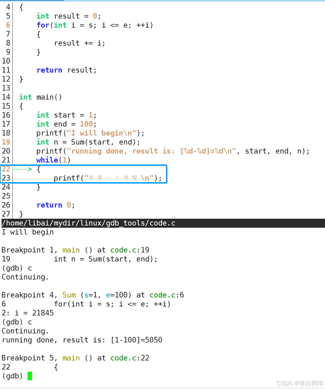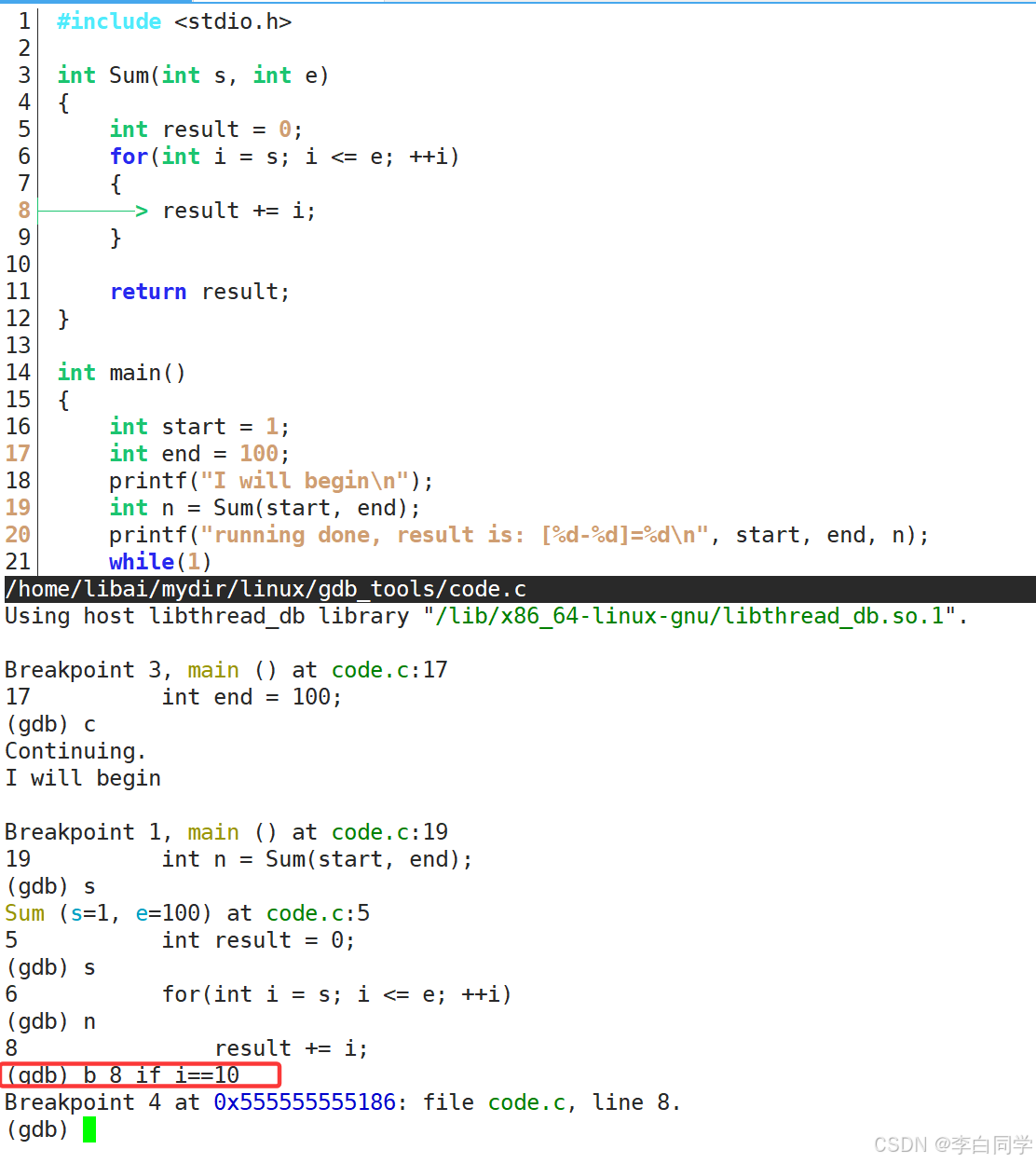 ~/mydir/linux/gdb_tools$ gcc -o code.exe code.c -g # debug 版本,支持调试