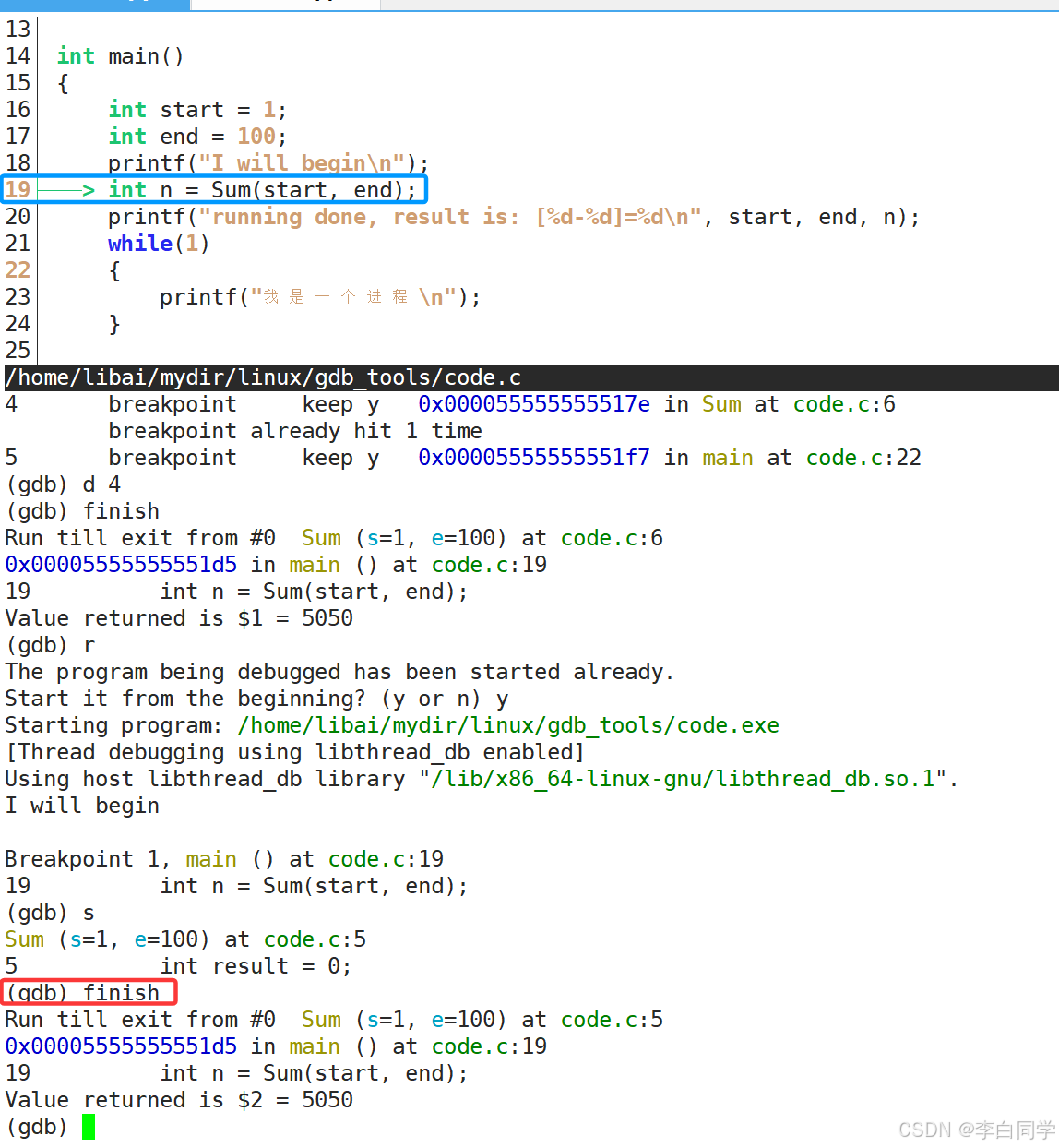 **3.11 执行到当前函数返回,然后停止:**finish(前提是中间没有断点,要不然会跳到断点处)