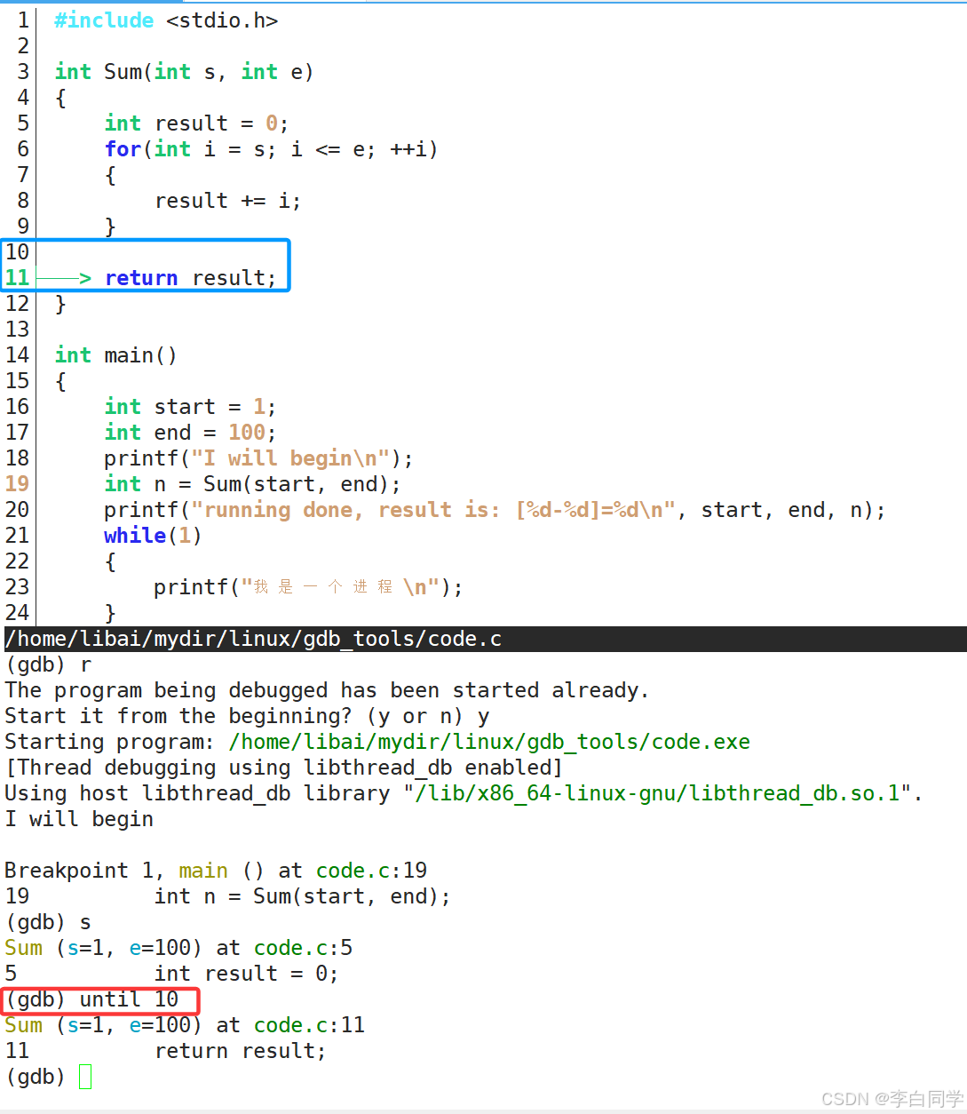 **3.9 跳转到指定行:**until 行号(前提中间没有断点)