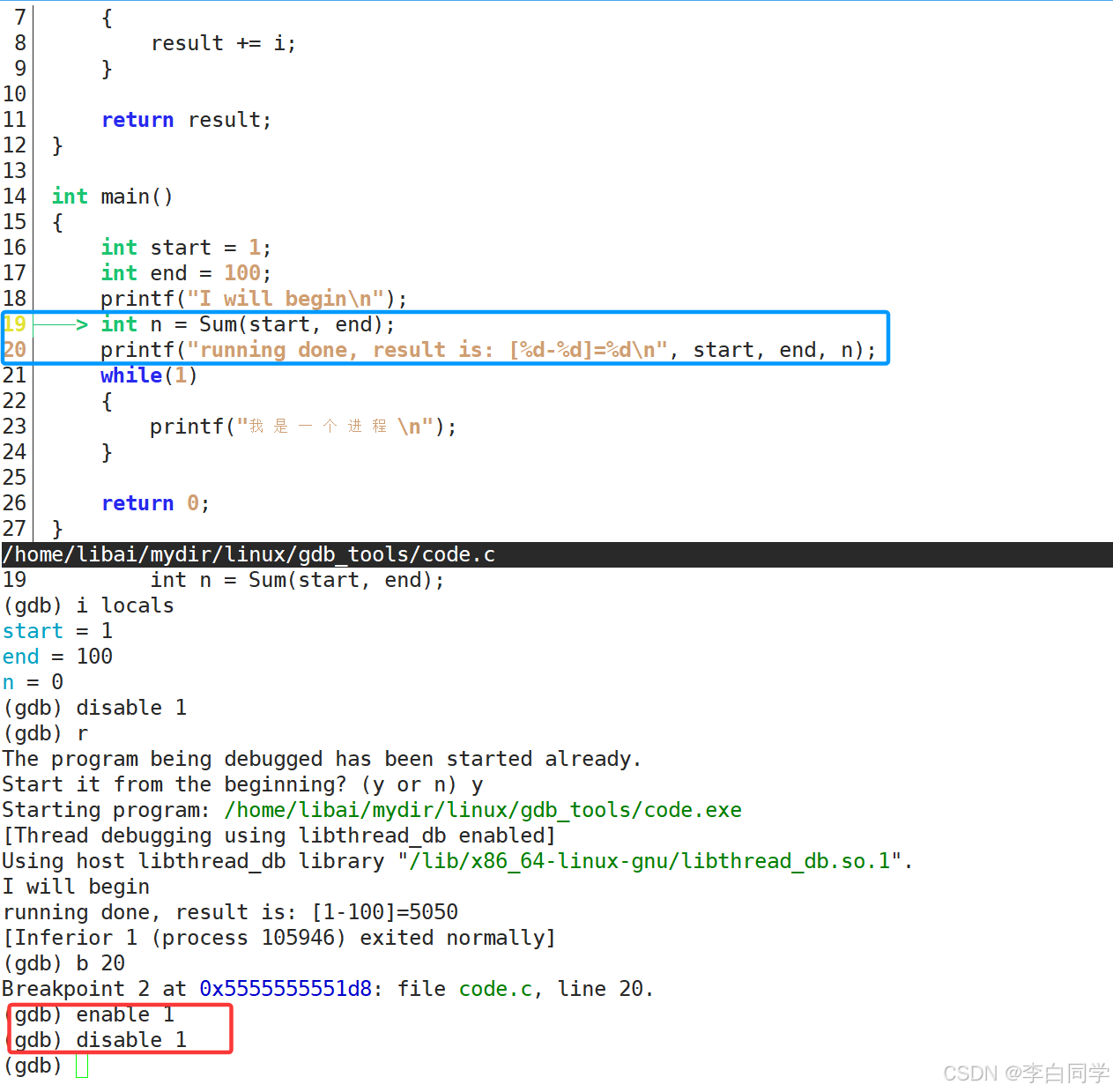 **3.14 禁用断点:**disable 断点编号,禁用的断点hui'bia