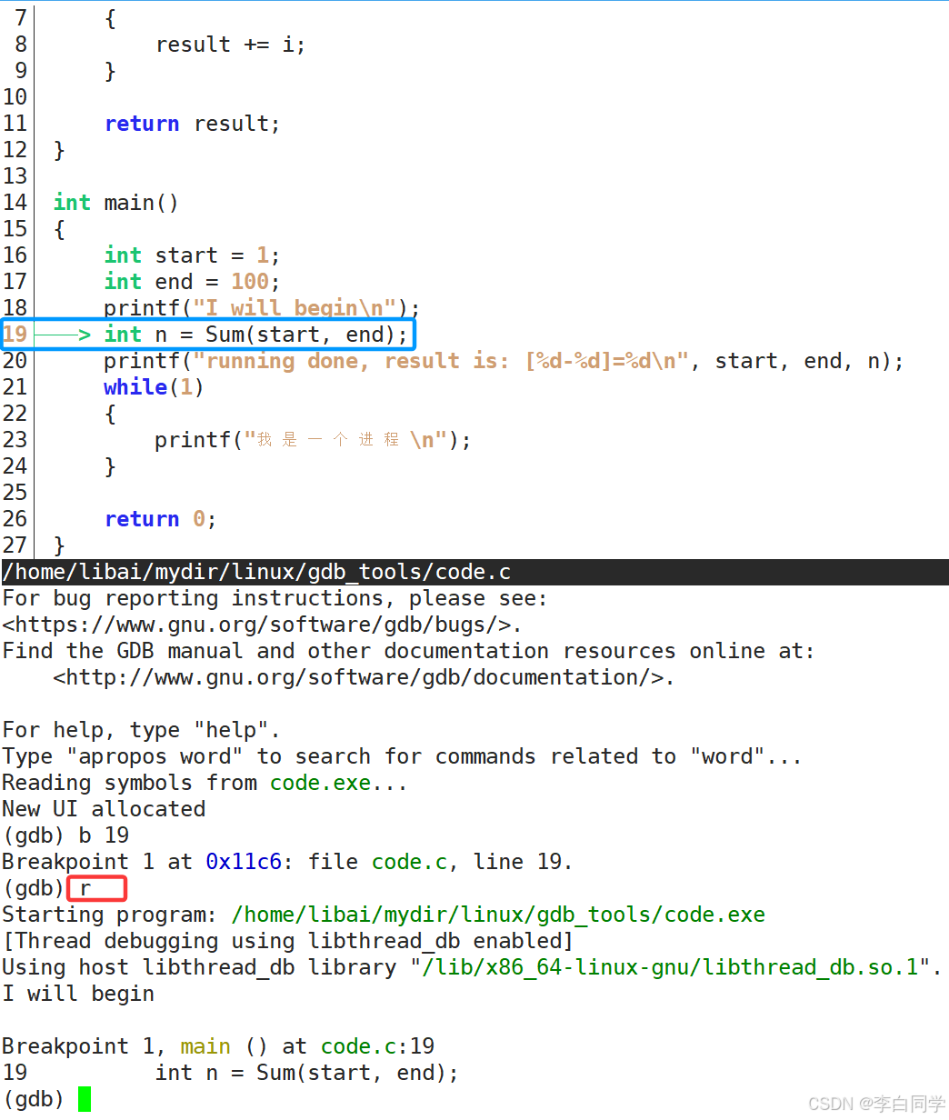 **3.2 运行:**r 命令会从当前的断点开始运行