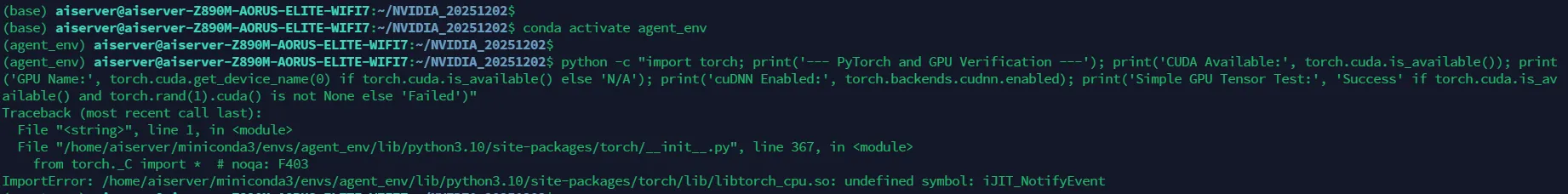 您遇到的 ImportError 错误,即 undefined symbol: iJIT_NotifyEvent ,通常是由于 PyTorch 库 在尝试加载时,找不到它所依赖的某个 系统库文件 或 GCC 编译器库版本不匹配造成的。
