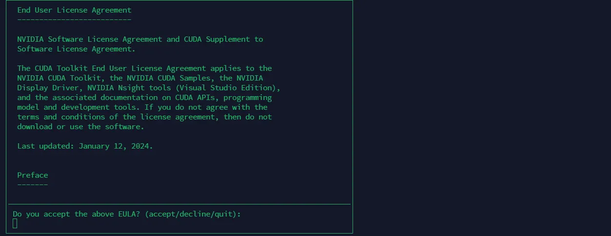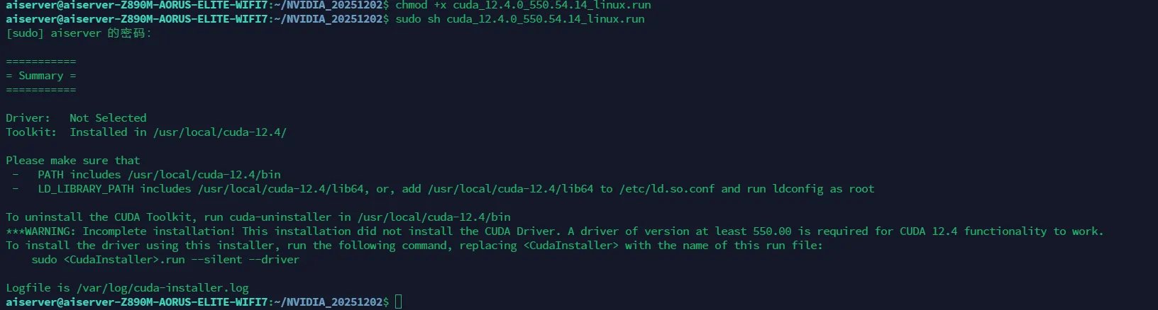 • 取消选择 Driver: 使用方向键将光标移动到 [ ] Driver 550.54.14,然后按 空格键 取消选中。需要安装 CUDA Toolkit。