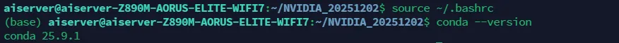 运行 conda --version 提示 "conda:未找到命令",这说明 Miniconda 已经安装,但是当前的 shell 会话还没有加载 Miniconda 的配置。