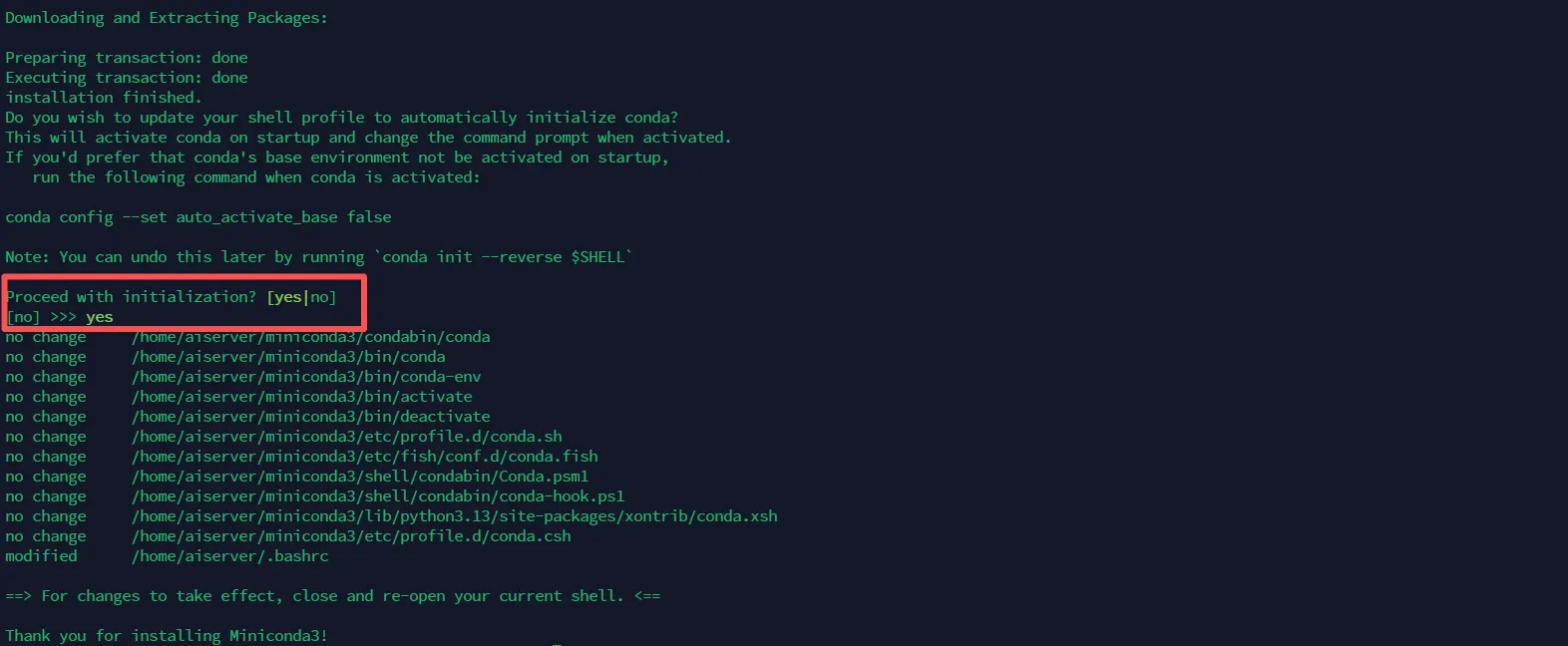 这是因为选择了在安装时运行 conda init,但它只修改了 .bashrc 文件,而需要手动运行 source 命令来使其在当前会话中生效。