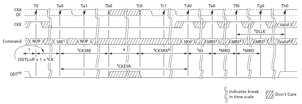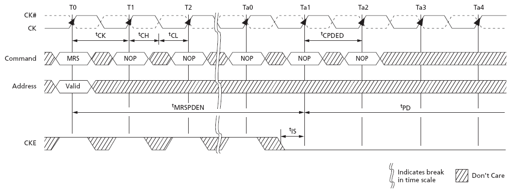 Power-down 模式以后,芯片禁止所有的输入输出信号,包括 CK、 CK#、 ODT、 CKE