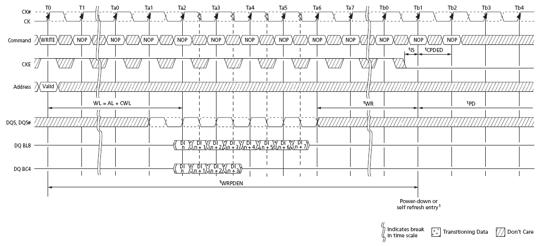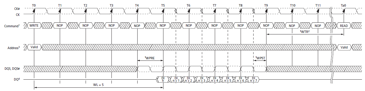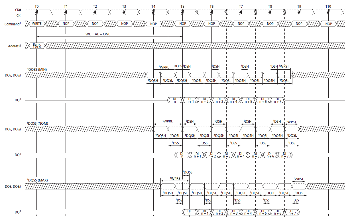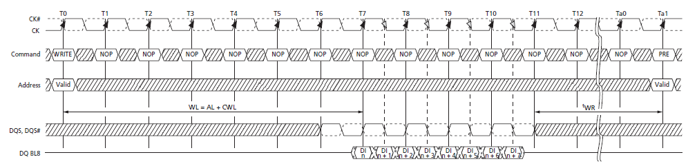 在突发写入操作中,第一个可用的输入数据在 WL 延时后的 DQS 的第一个上升沿被锁存,而后续的输入数据在每个 DQS 的上升沿/下降沿被锁存。