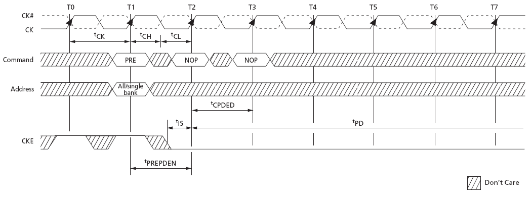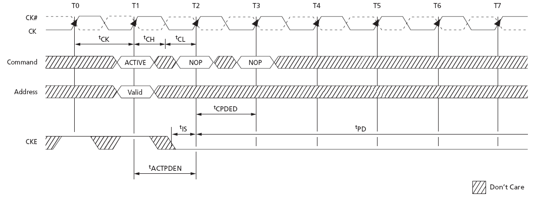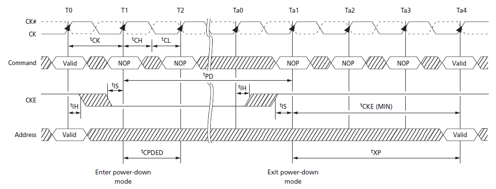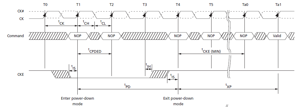 当 CKE 拉低后执行 NOP 或 DES 指令,芯片就进入 Power-down 模式。进入