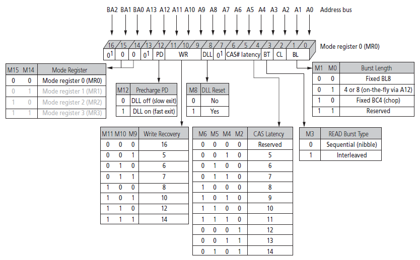 MR0 模式寄存器用来定义 DDR3 SDRAM 的突发长度(Burst Length)、突发类型(Burst Type)、CAS 延迟(CAS latency)、操作模式、DLL 复位、写恢复和预充电 Power_down 模式,如图 5 所示。