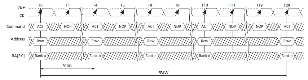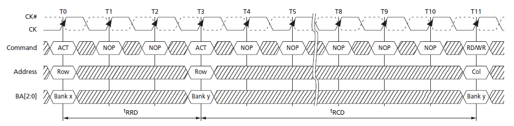 激活操作(ACTIVATE)是指在读取或者写入操作之前,芯片需要将要操作的Bank 和 Row 进行激活,方便后续的操作。激活操作是通过激活命令实现的,在激活命令经过时间 tRCD 后,可以进行读取或写入操作,而在不同 Bank 之间激活命令的间隔时间是 tRRD,如图 10 所示。