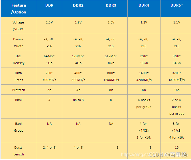 除了电压,容量和IO的速率变化之外,还包含Bank、Bank Group、Prefetch和Burst Length的演进,bank数越来越多,到DDR4出现bank group,prefetch也从2n增加到4n、8n。