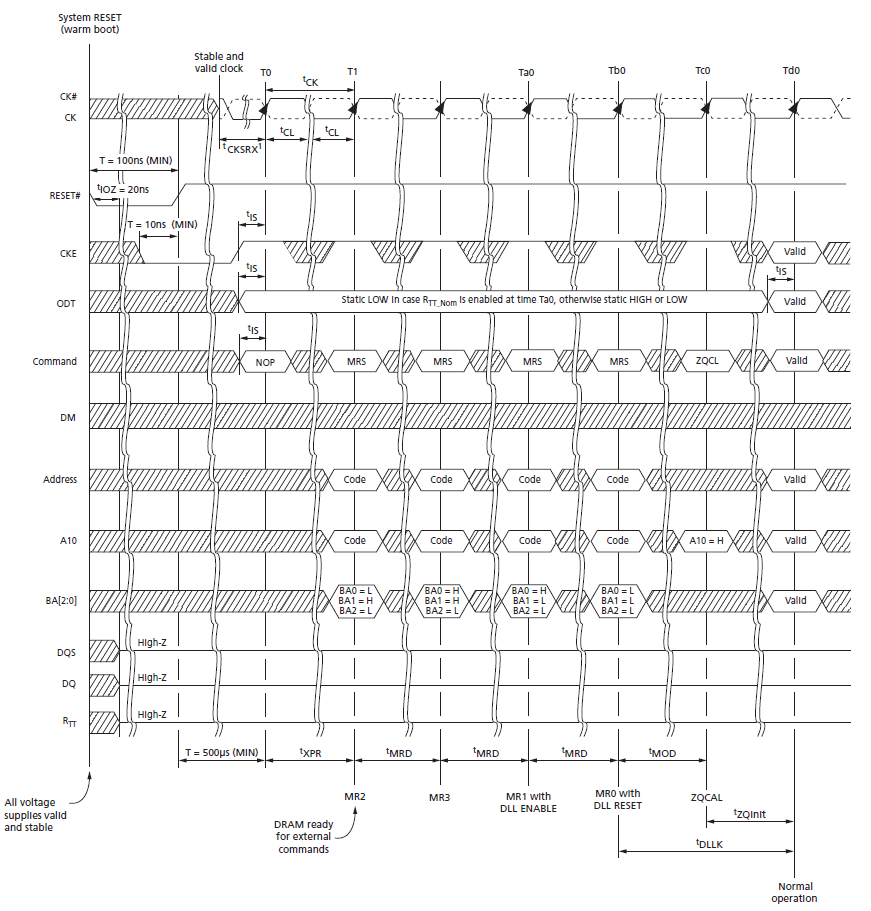 此过程中,芯片输出禁止, ODT 关闭,芯片复位。当退出复位操作以后,芯片必须