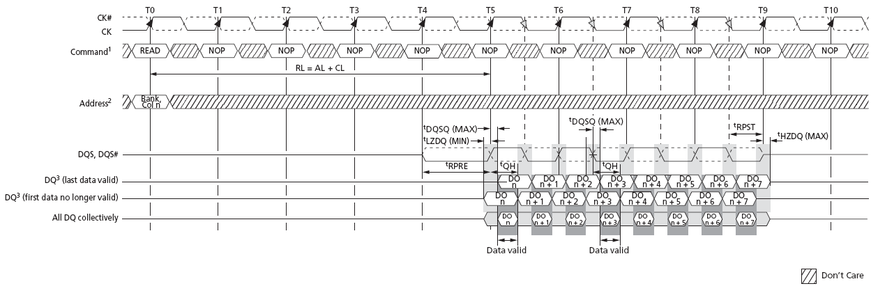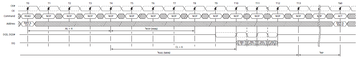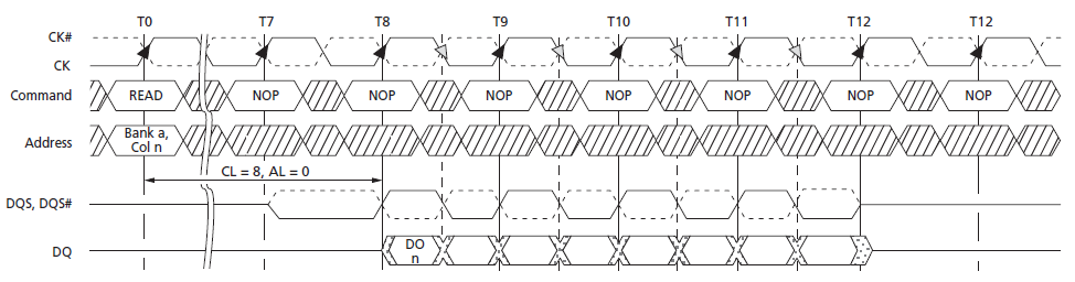 突发读取操作是通过读取命令实现的,在读取命令中提供开始读取数据的Column 和 Bank,然后经过读取延迟(Read Latency)后,连续读出指定数量的数据。RL 的值由 AL 和 CL 定义, RL=AL+CL。 AL 和 CL 的值可通过 MRS 命令进行定义。图 11 展示了 CL=8, AL=0 设置下的 RL 时序。