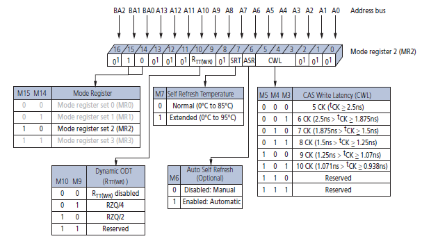 MR2 模式寄存器定义了 DDR3 SDRAM 的其他一些设置,有 CAS 写入延迟、自动自刷新(ASR)、温度自刷新(SRT)、动态 ODT 等,如图 7 所示。