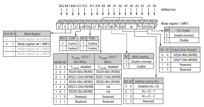 MR1 模式寄存器定义 DDR3 SDRAM 额外的一些设置,有数据输出使能(QOFF)、 DLL 使能/禁止、 ODT 的电阻值、写入均衡控制、 CAS 附加延迟设置和输出驱动强度选择等,如图 6 所示。