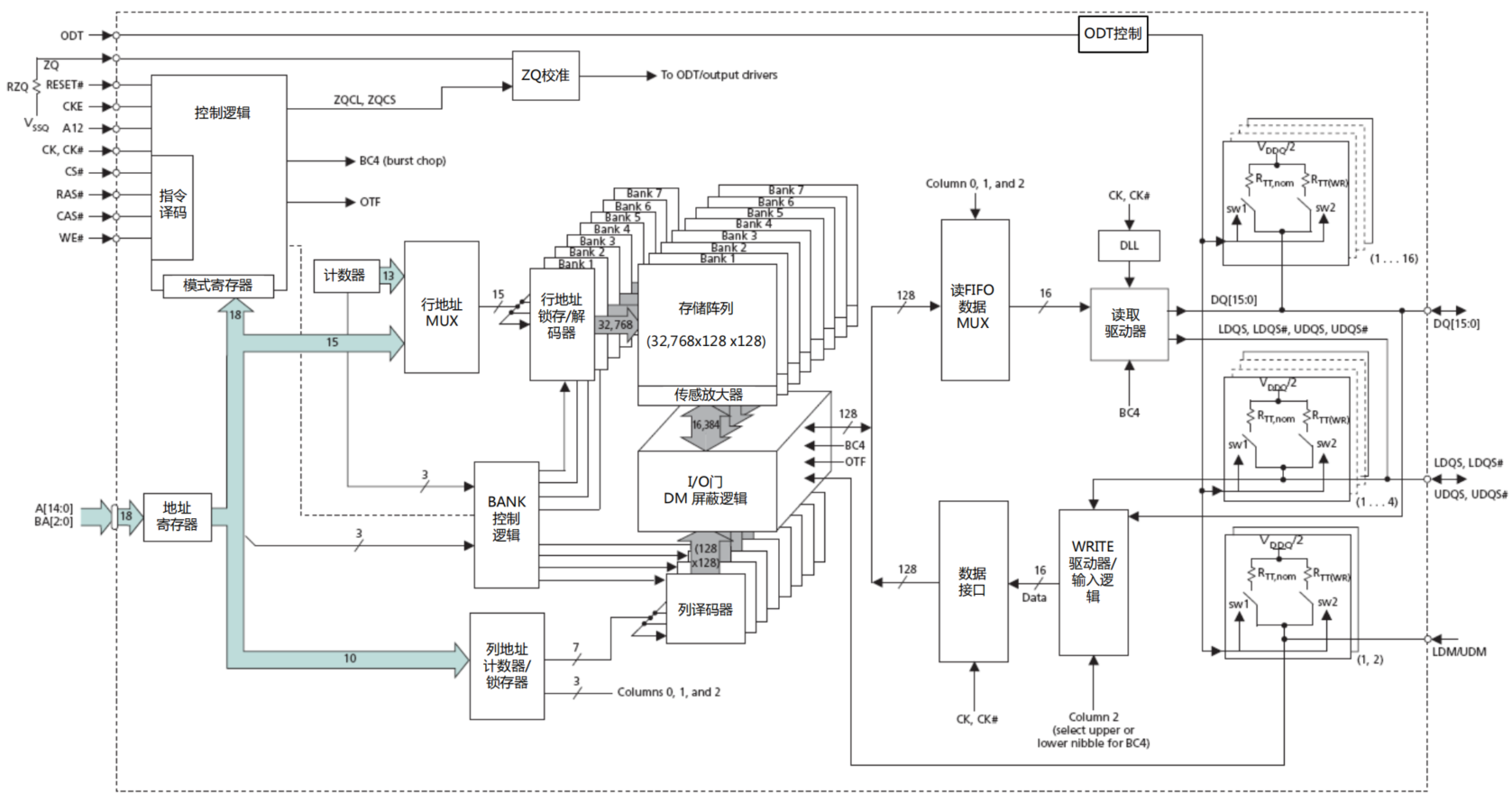 LDQS#是否使用,需要在模式寄存器中设置。 - UDQS、 UDQS#:高字节数据选通。