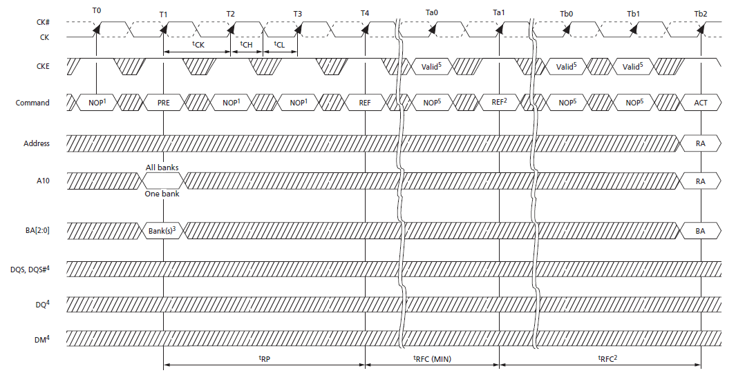 DRAM 需要每隔一段时间执行一次刷新操作,以保证存储数据不丢失。刷新操作时,地址由内部刷新控制器自动产生。刷新操作时序如图 16 所示。