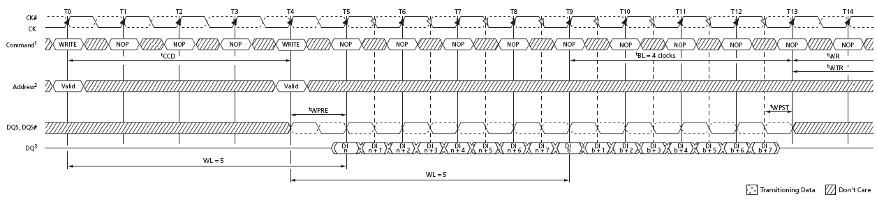 在写入命令和 DQS 的第一个上升沿之间的时间为 WL±tDQSS,图 14 中所表示的即为 tDQSS 的值处于正常情况和极限情况下的突发写入操作时序。