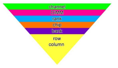 从内存控制器到内存颗粒内部逻辑,笼统上讲从大到小为:channel>DIMM>rank>chip>bank>row/column: