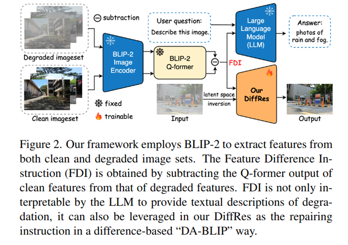 利用预训练的多模态视觉语言模型(如BLIP-2)提取特征差异指令(Feature Difference Instruction, FDI),作为退化感知的修复指导。