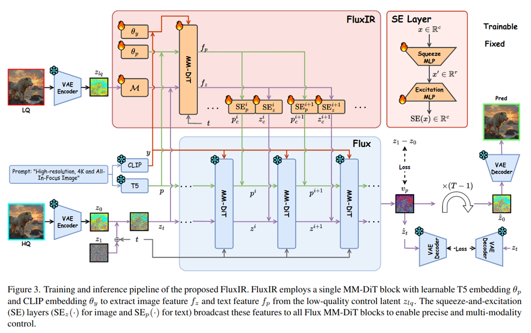 通过FluxGen得到的 𝑧 0 𝑧_0 z0和 𝑧 𝑙 𝑞 𝑧_{𝑙𝑞} zlq,同时CLIP和T5对提示编码得到Font metrics not found for font: .和Font metrics not found for font: .,然后通过MM-DiT模块,会得到图像和文本的注意力。FluxGen冻结Flux主干用于生成训练数据(低质量-高质量)图像对。FluxIR轻量级的适配器,把低质量的图像信息作为一种控制信息,输入到Flux的每个Dit,指导Flux的生成。