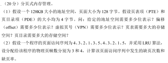 第 (1) 问是分页地址的拆分 + 页表 / 页目录的大小计算 ,核心是 "虚拟地址 = VPN+offset" 的拆分逻辑;第 (2) 问是LRU 算法的模拟,核心是 "满页时替换最近最久未用的页面"。