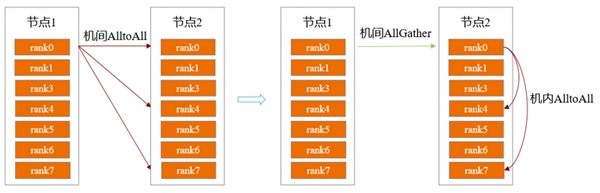 昇思MindSpore团队针对这一问题,采用跨机AllGather通信与机内AlltoAll通信相结合的方式,解决AlltoAll机间通信性能差的问题。首先将所需的tokens通过跨机AllGather同步到机间,然后在机间进行tokens的排序与AlltoAll通信。基于这种分层的通信方式降低了跨机通信数据量,有效地提升了整体通信性能。经过在DeepSeek V3 671B实训测试,在EP=16时端到端吞吐性能提升15%。机间通信合并与原始通信方案的示意如图1。