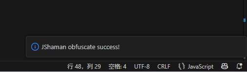 2.打开需要混淆的代码文件,按 Ctrl+Shift+P,输入:obfuscate命令,回车,稍等几秒钟右下角会提示生成成功: