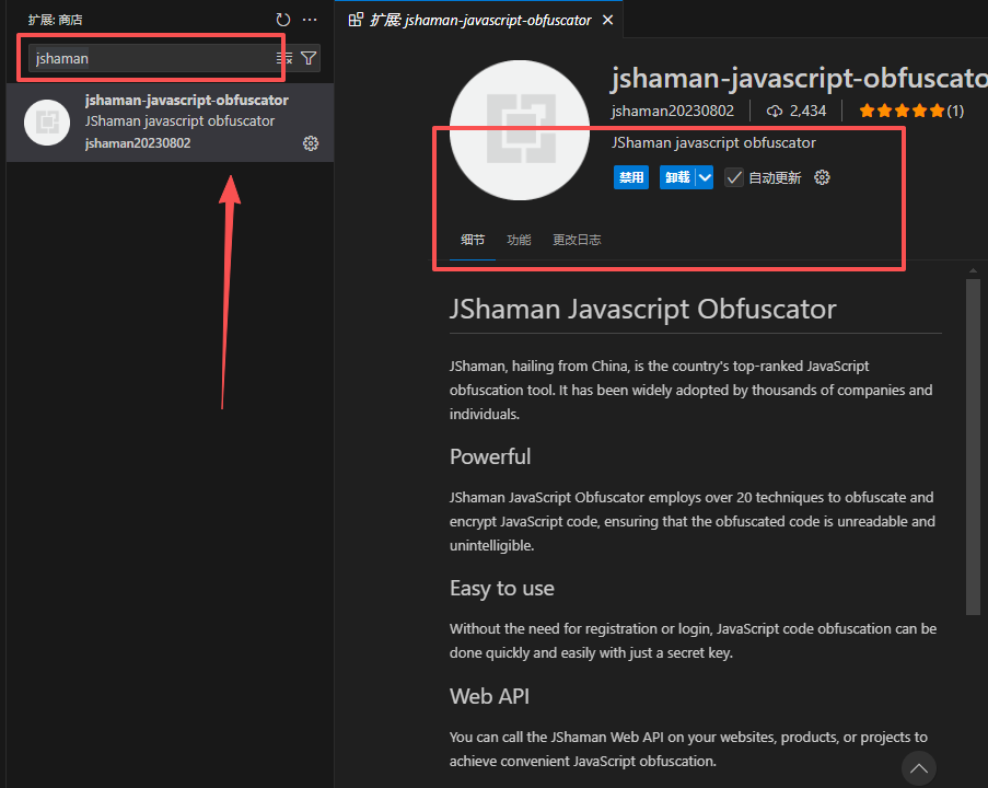 1.打开vscode按 Ctrl+Shift+X ,搜索:jshaman,点击安装,如图: