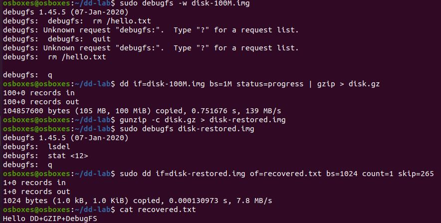 echo "Hello DD+GZIP+DebugFS" | sudo tee /mnt/hello.txt